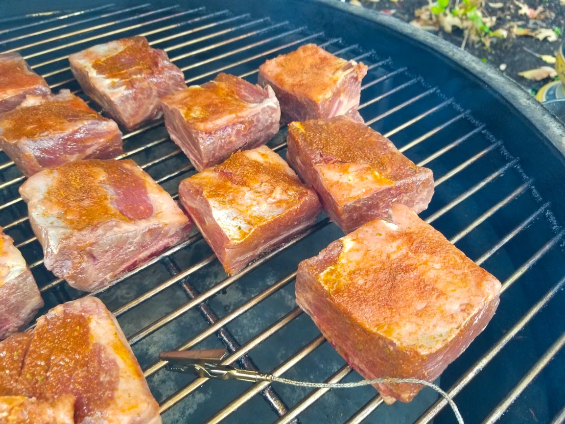 I grabbed 15 short ribs from Central Market. For those needing it, I trimmed away the excess fat - maybe about half of them. Then a coating of BGE all purpose rub. The Egg was set at 265 degrees, the temperature was controlled by a Flame Boss 300. Here they are, ready to begin Stage One of their journey.